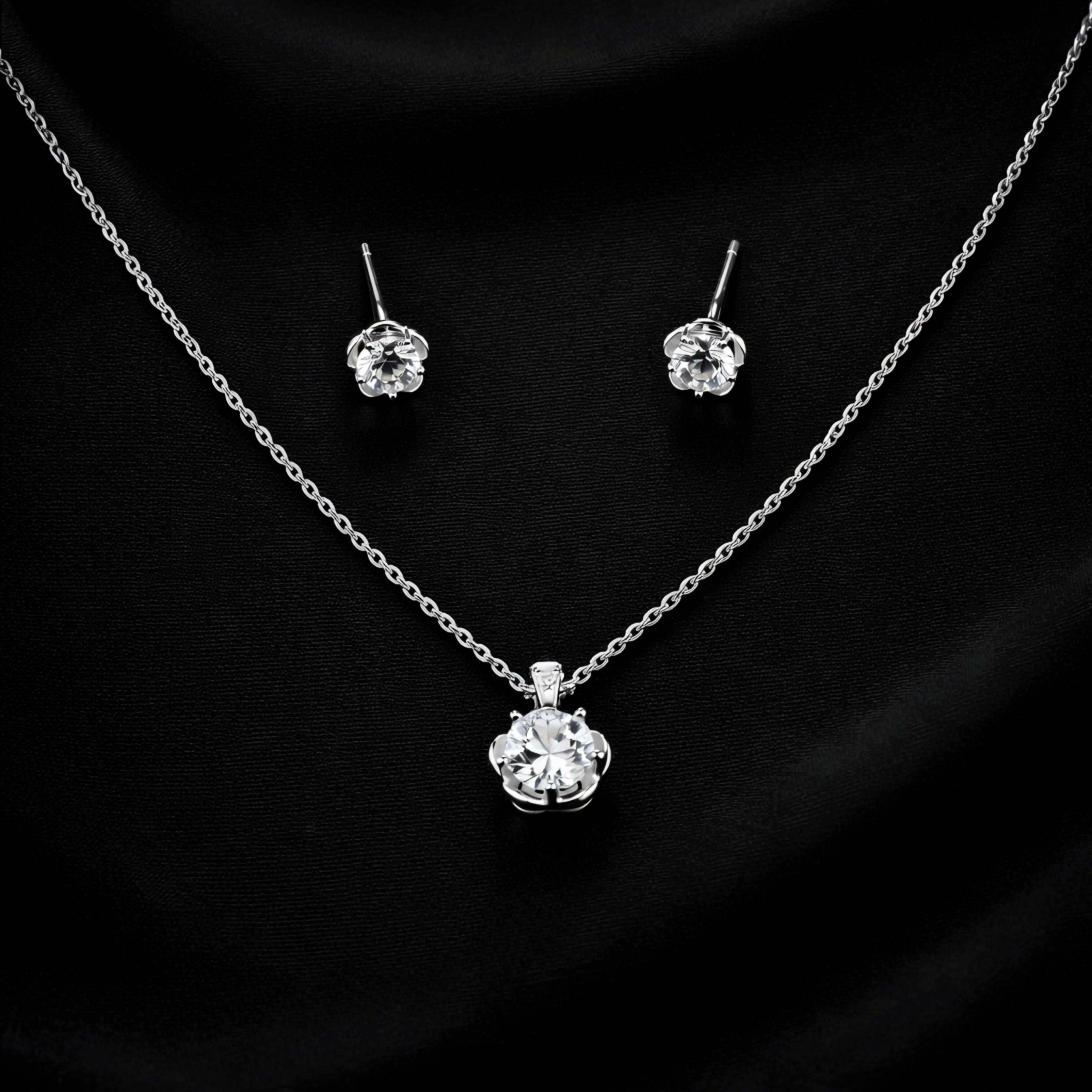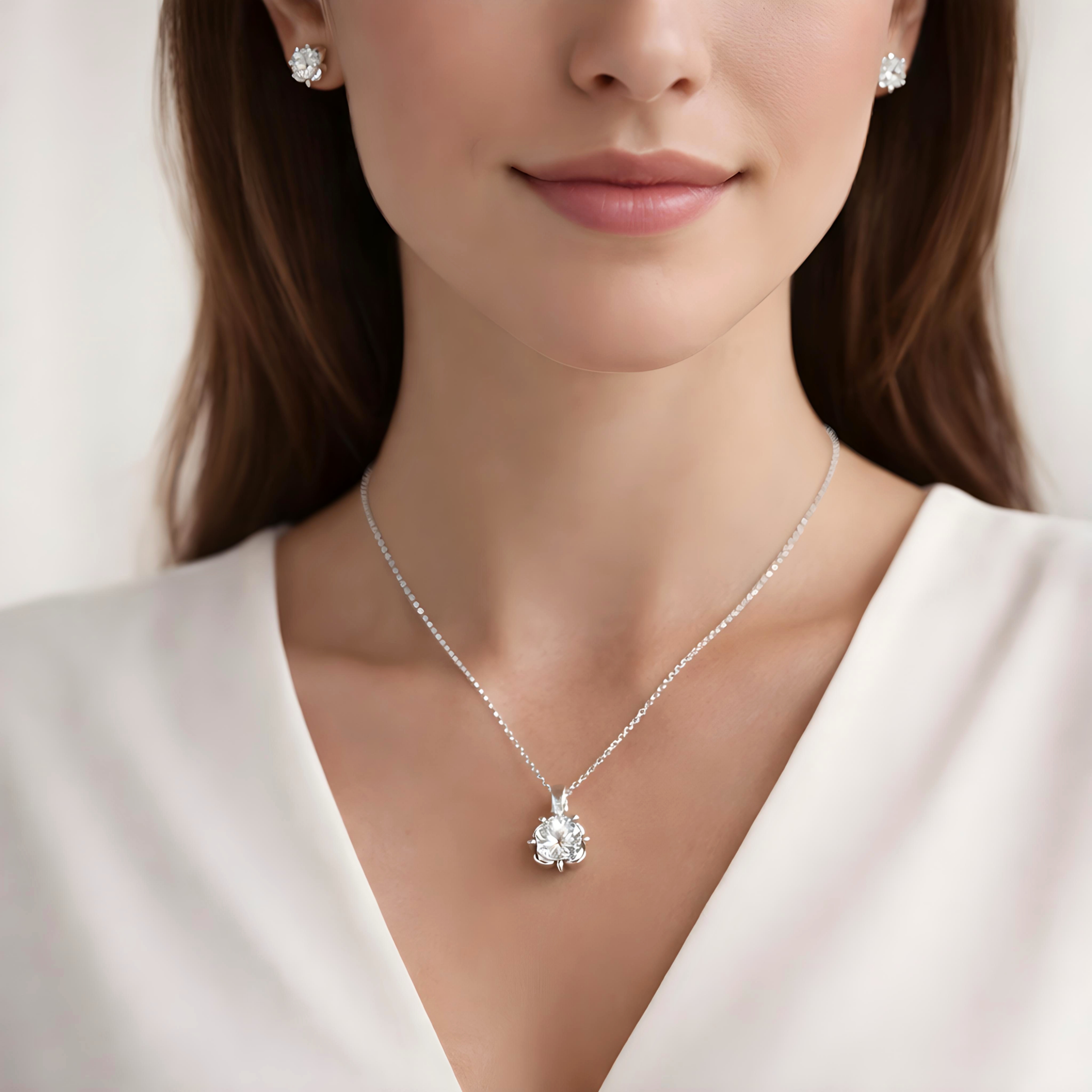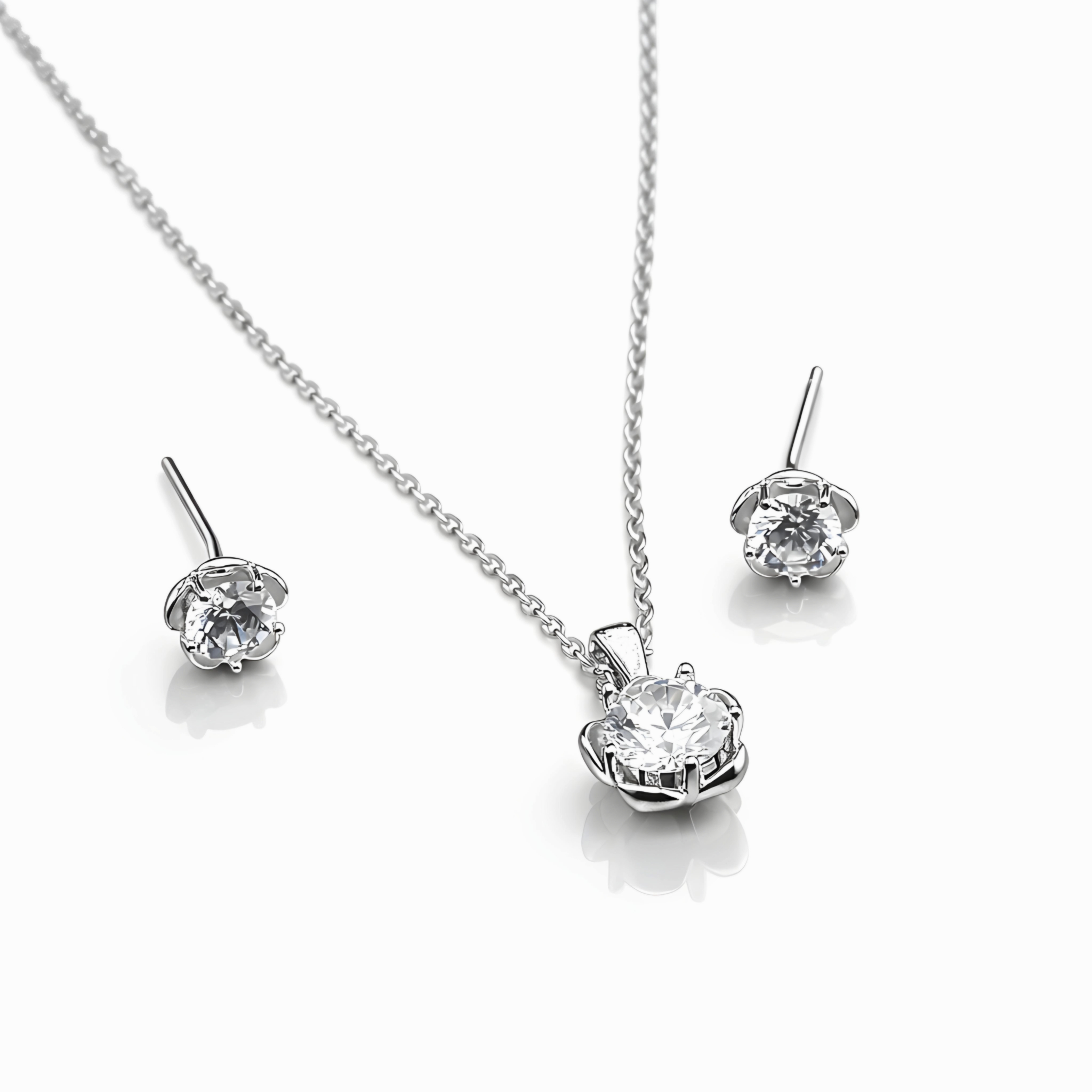 Timeless sparkle, beautifully crafted. This elegant pendant and stud set is designed in 925 sterling silver, featuring brilliant round-cut solitaires nestled in a delicate floral-inspired setting. The petal-like prongs enhance the brilliance of the center stone while adding a soft, feminine touch. Minimal yet radiant, this set is perfect for everyday elegance, office wear, special occasions, or thoughtful gifting. Its classic design ensures it never goes out of style — making it a must-have in every jewelry collection.