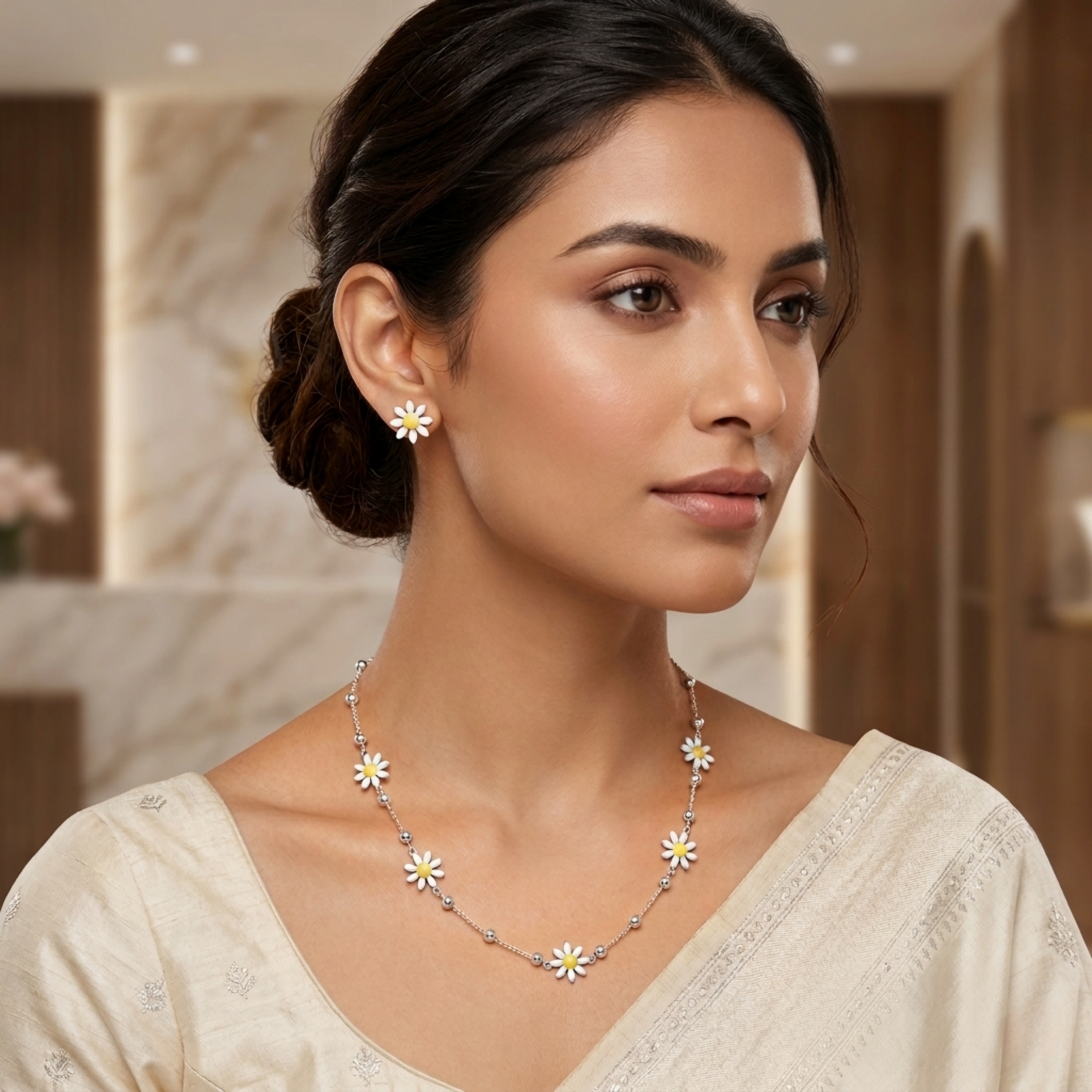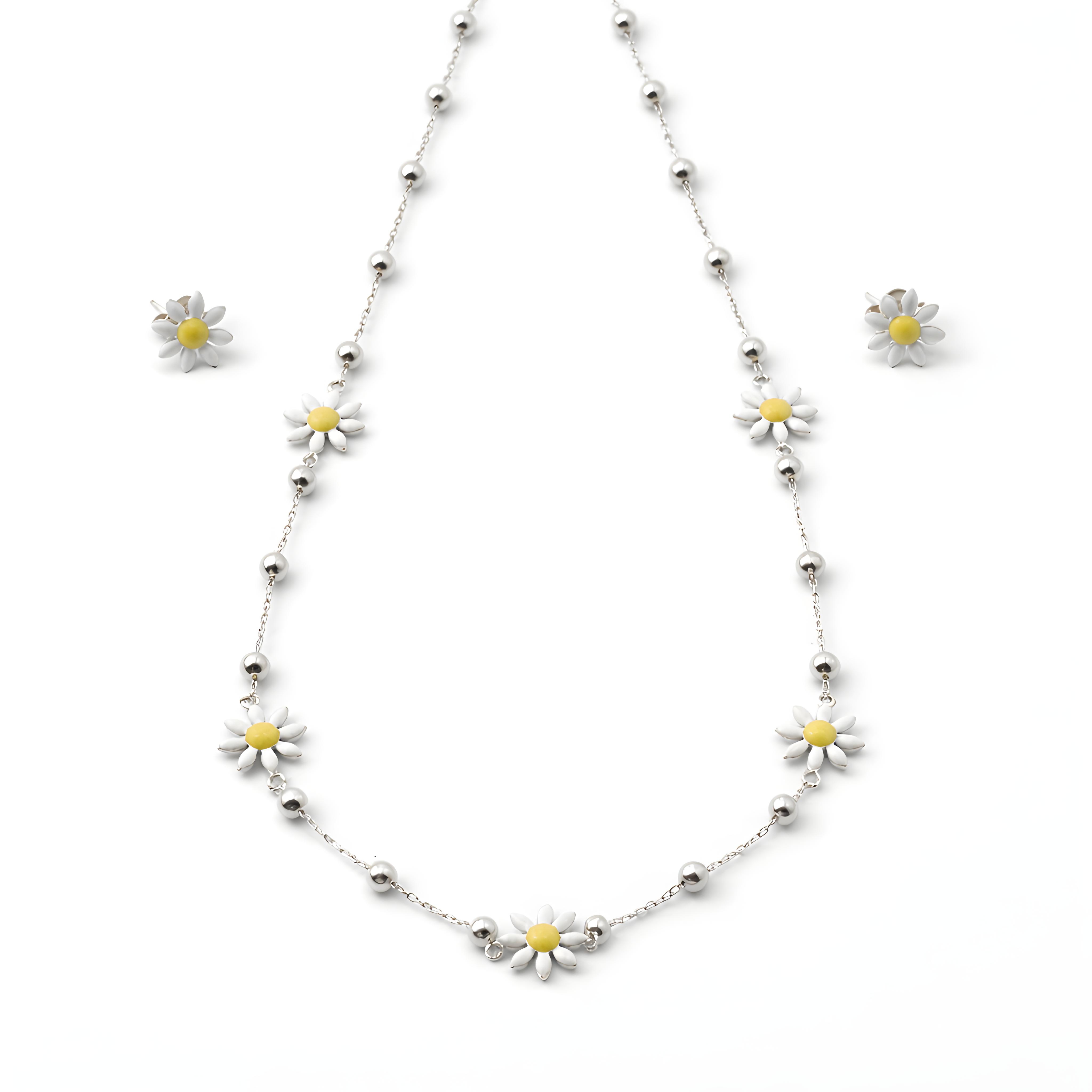 925 Sterling Silver & Enamel | Fresh & Cheerful 🌼 Bring a blooming garden to your wardrobe with this delightful 925 Silver set. Featuring crisp white enamel daisies on a dainty hallmark silver chain, this set is hypoallergenic and skin-friendly. The matching daisy studs complete a youthful, sunny look. Vibe: Fresh, floral, and bright. Material: Premium 925 Silver with durable enamel.